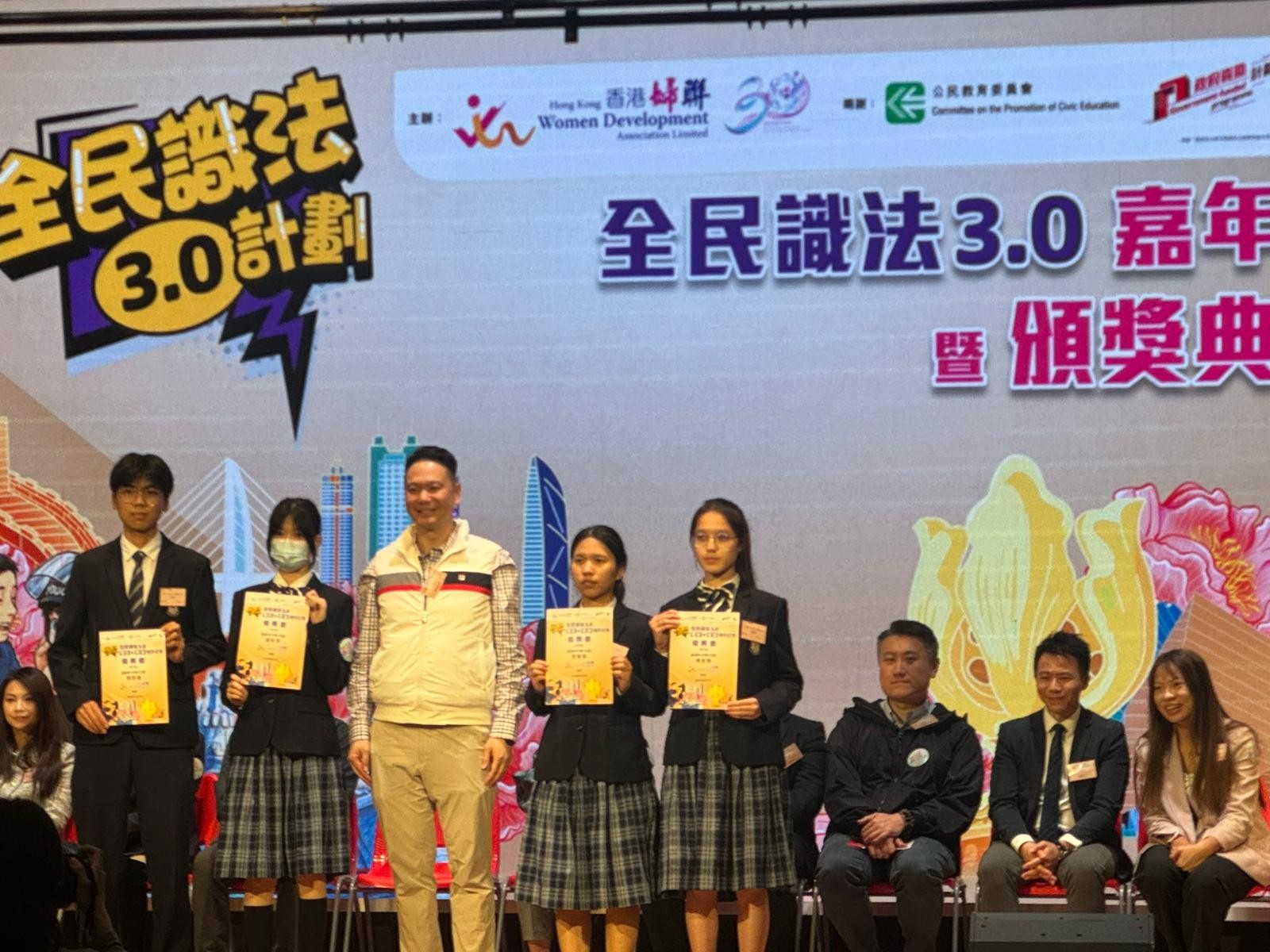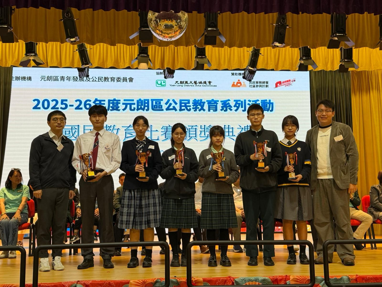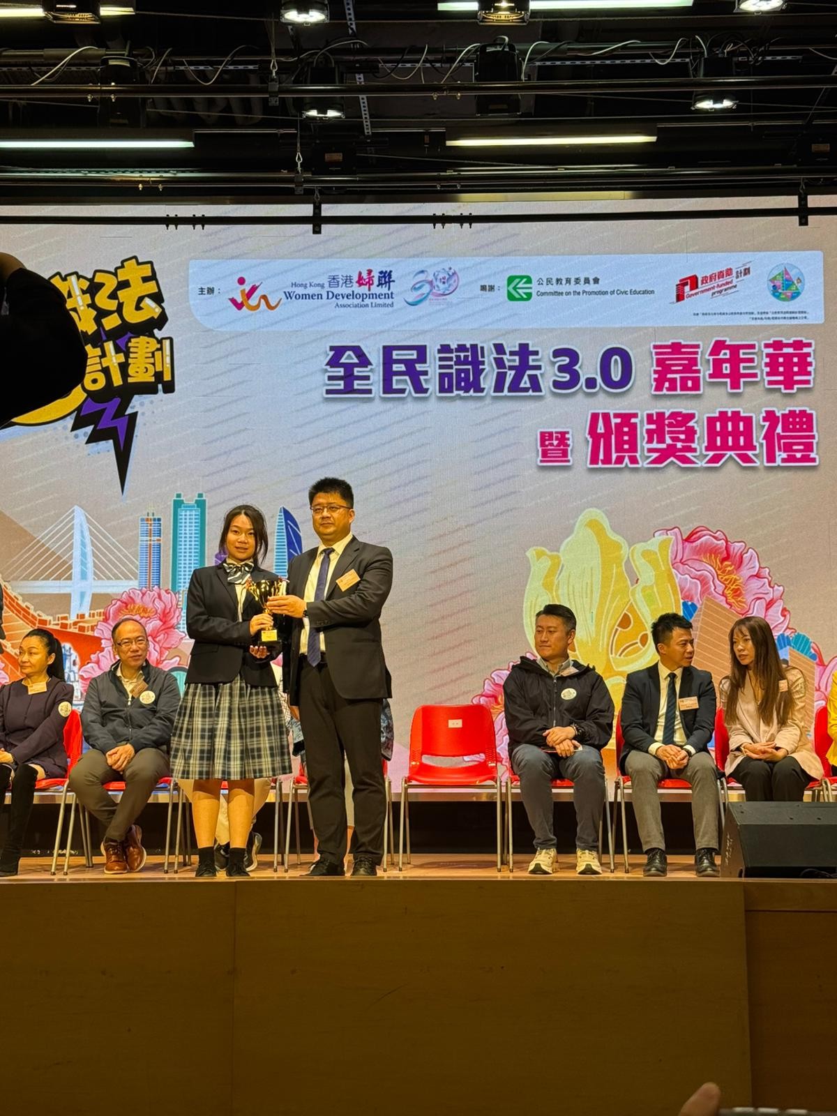 獎項一: 本校參加由香港婦聯舉辦的<全民識法3.0問答及標語創作比賽頒獎禮。本校中四級傅沛妍獲全港冠軍,另有18位高中同學獲優異獎,本校獲<學校積極參與獎>。26年2月7日(星期六)假元朗區綜合服務大樓禮堂舉行的頒獎禮。