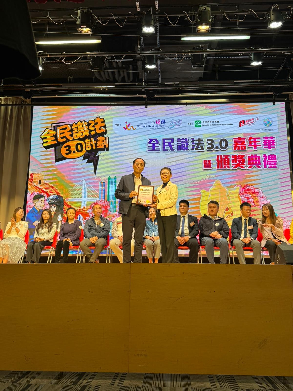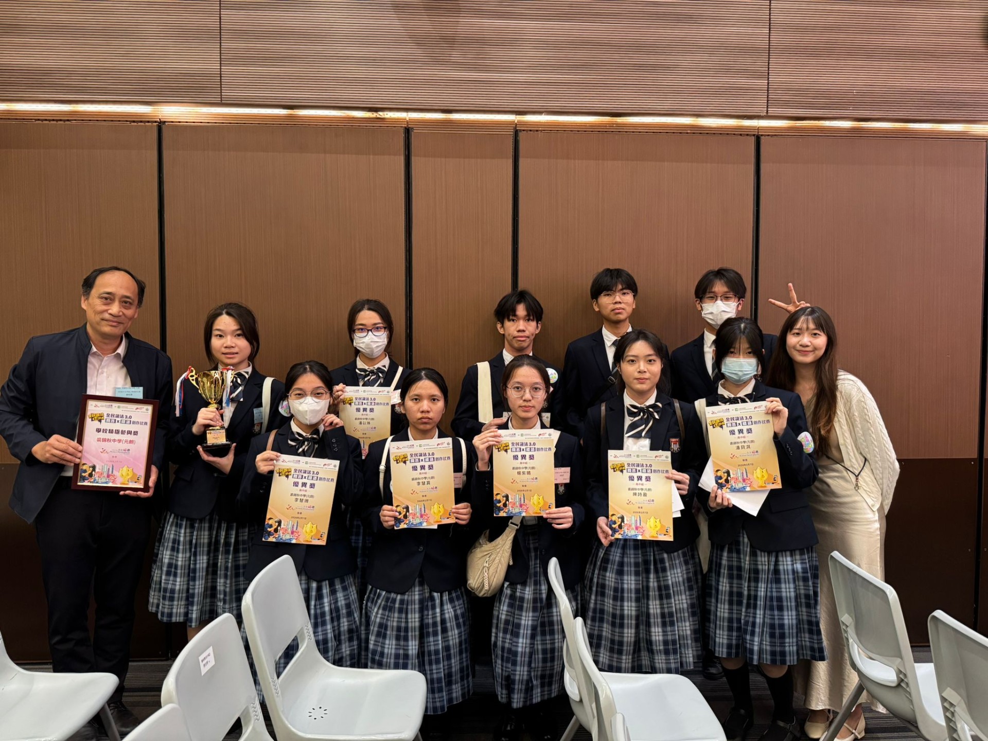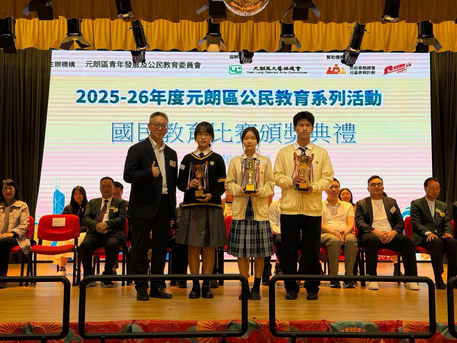 獎項一: 本校參加由香港婦聯舉辦的<全民識法3.0問答及標語創作比賽頒獎禮。本校中四級傅沛妍獲全港冠軍,另有18位高中同學獲優異獎,本校獲<學校積極參與獎>。26年2月7日(星期六)假元朗區綜合服務大樓禮堂舉行的頒獎禮。