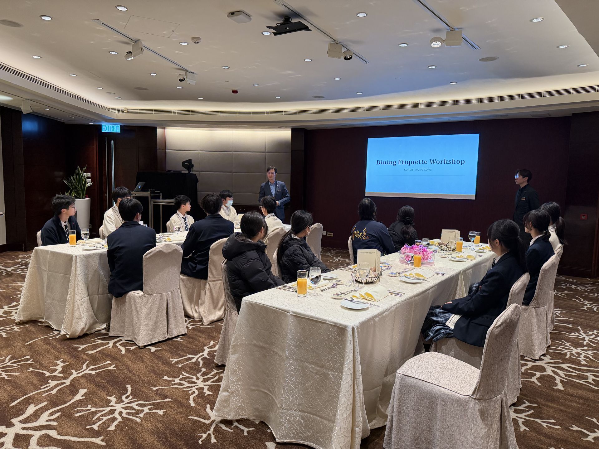 中五級旅遊與款待科前往香港康得思酒店,參加由酒店舉辦的餐桌禮儀工作坊及酒店參觀,透過講解和示範,學習如何佈置餐桌、閲讀菜單、辨識和使用餐具、安排座位;並安排午餐環節,以實踐正統的餐桌禮儀。