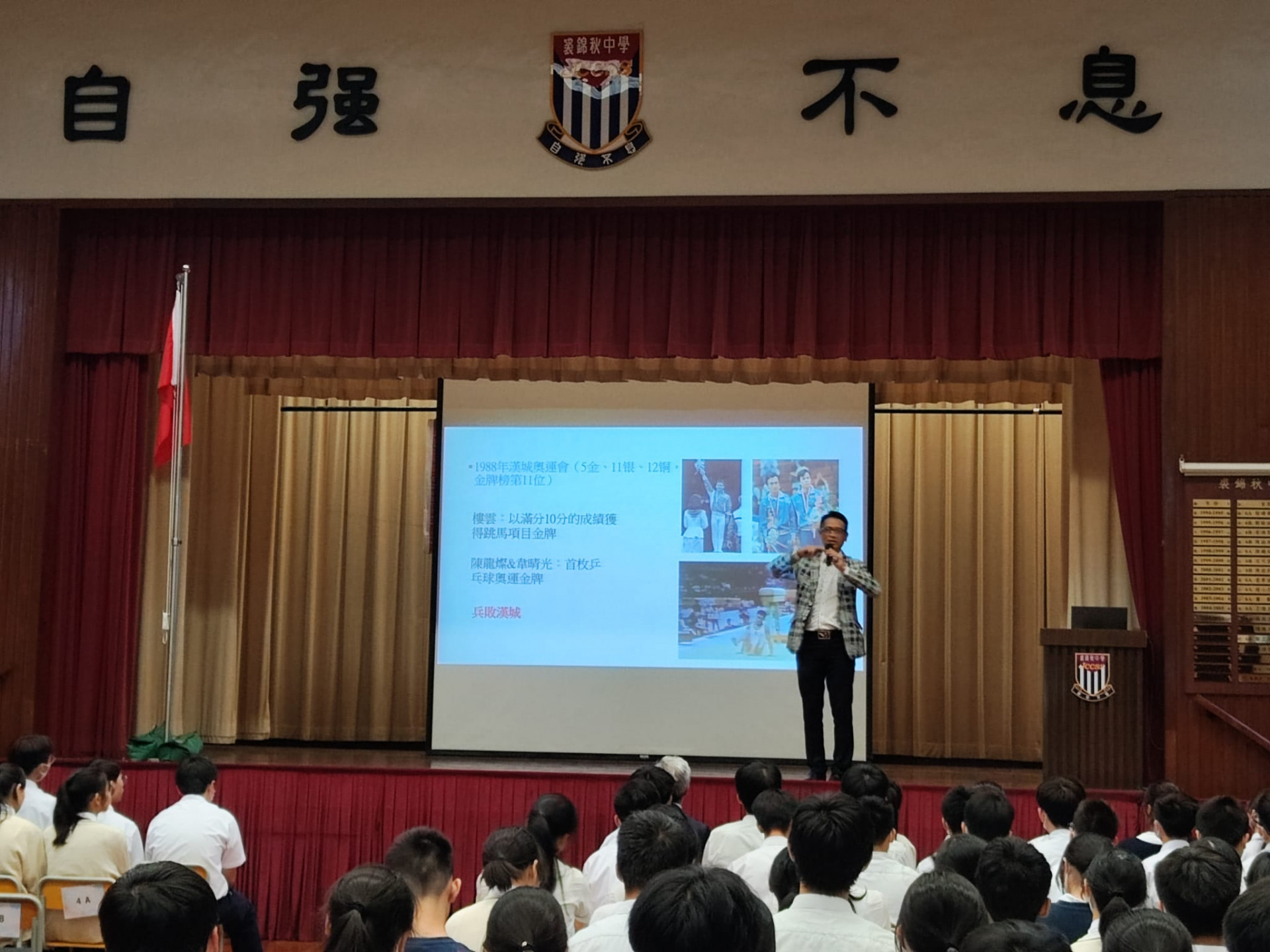 適逢國家先後舉辦成都大運會及杭州亞運會,本校藉此契機舉辦活動,以「從大變強•國家的體育強國夢」為主題,榮幸邀請了香港浸會大學劉永松教授親臨講解「國家體育發展之歷程與成就」,增加同學們對國情的瞭解,同學亦積極向劉教授發問。此外,本會亦讓學生搜集國家體育發展的歷史和成就,製作成展板,並安排全校同學觀看展板資料,完成閱讀工作紙,提升學生的資料搜集技巧和學術能力。
